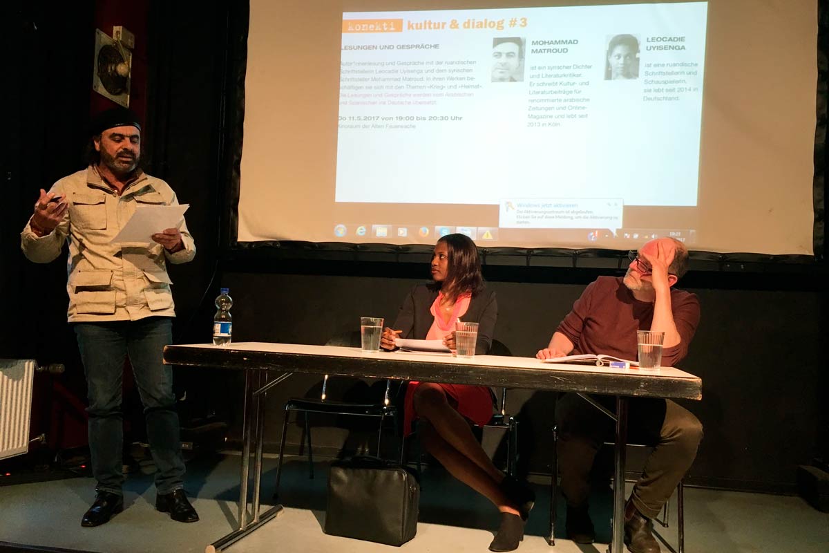 Autor*innen Lesung und Gespräche mit der ruandischen Schriftstellerin Leocadie Uyisenga und dem syrischen Schriftsteller Mohammad Matroud. In ihren Werken beschäftigen sie sich mit den Themen „Krieg“ und „Heimat“.