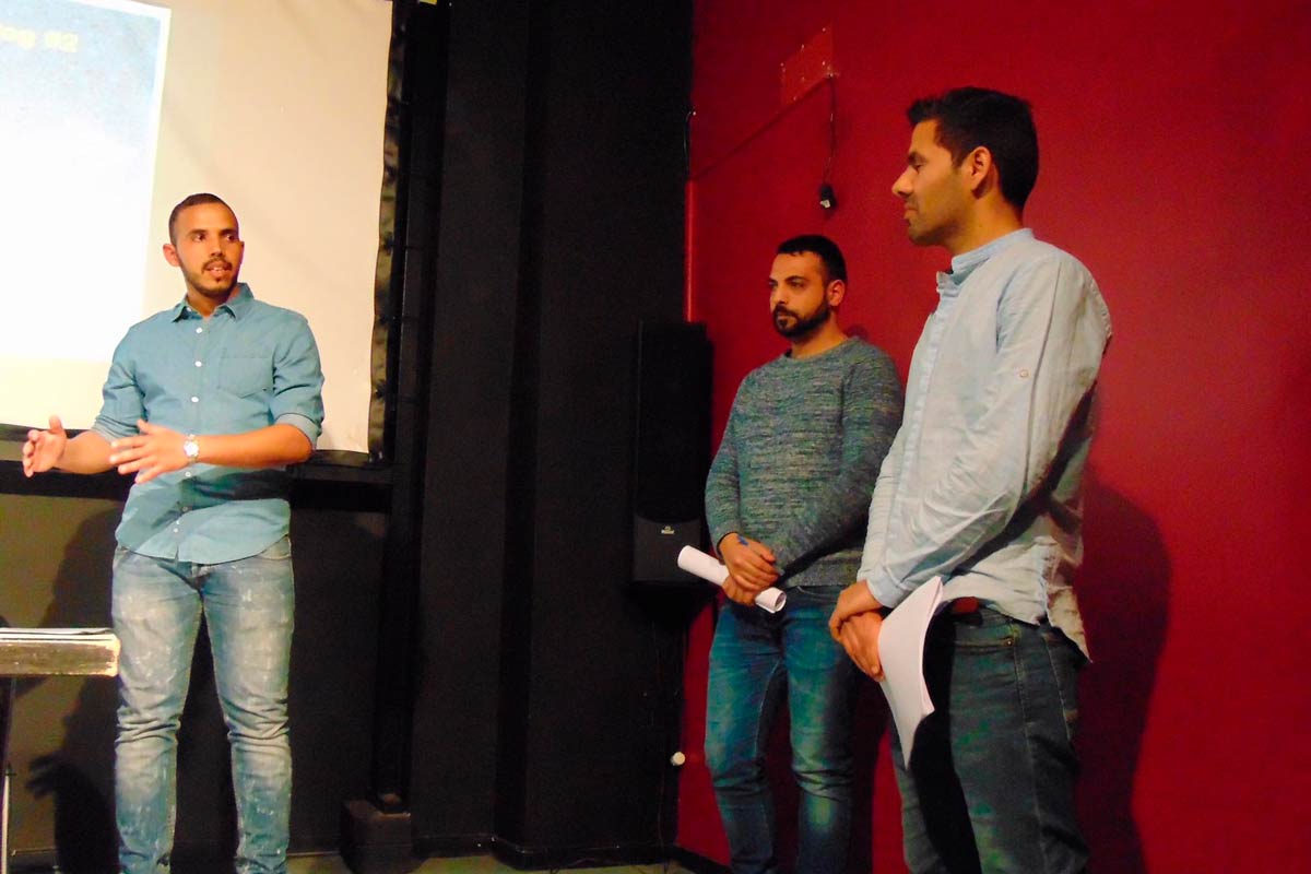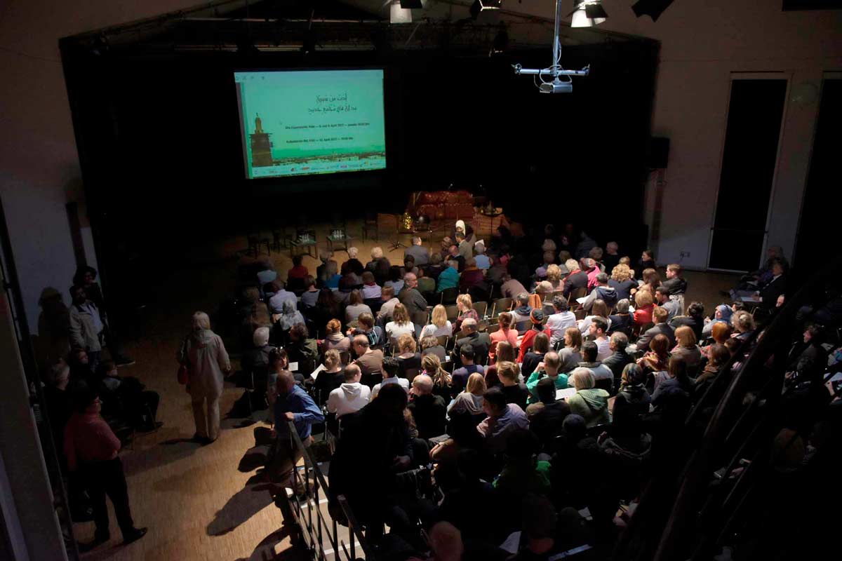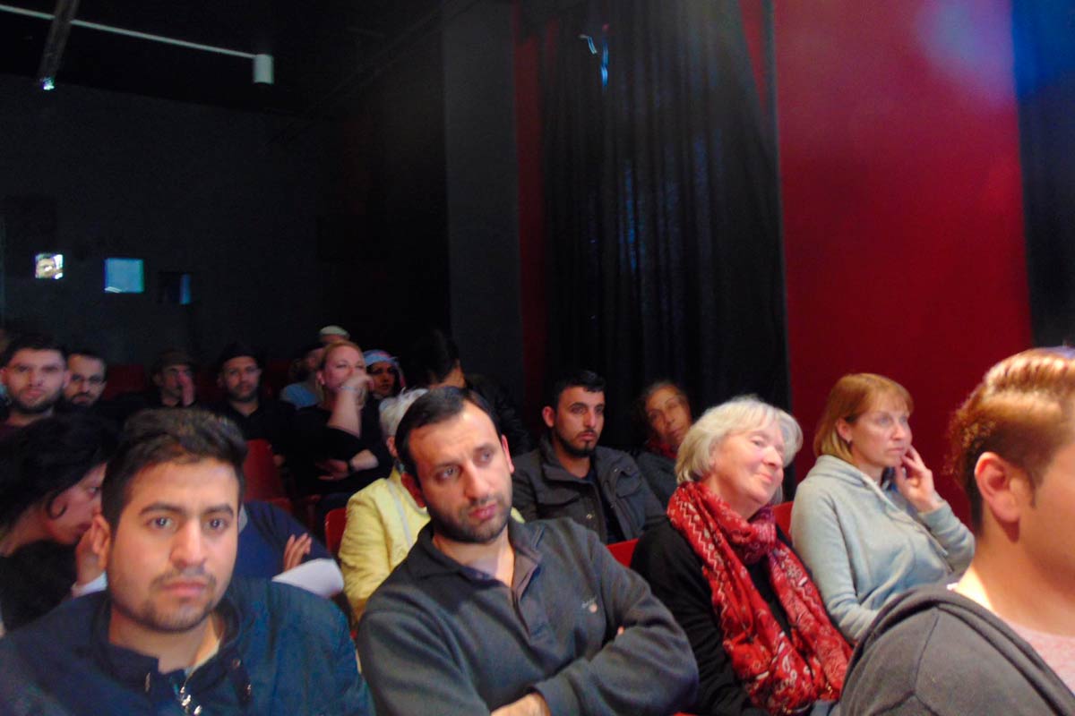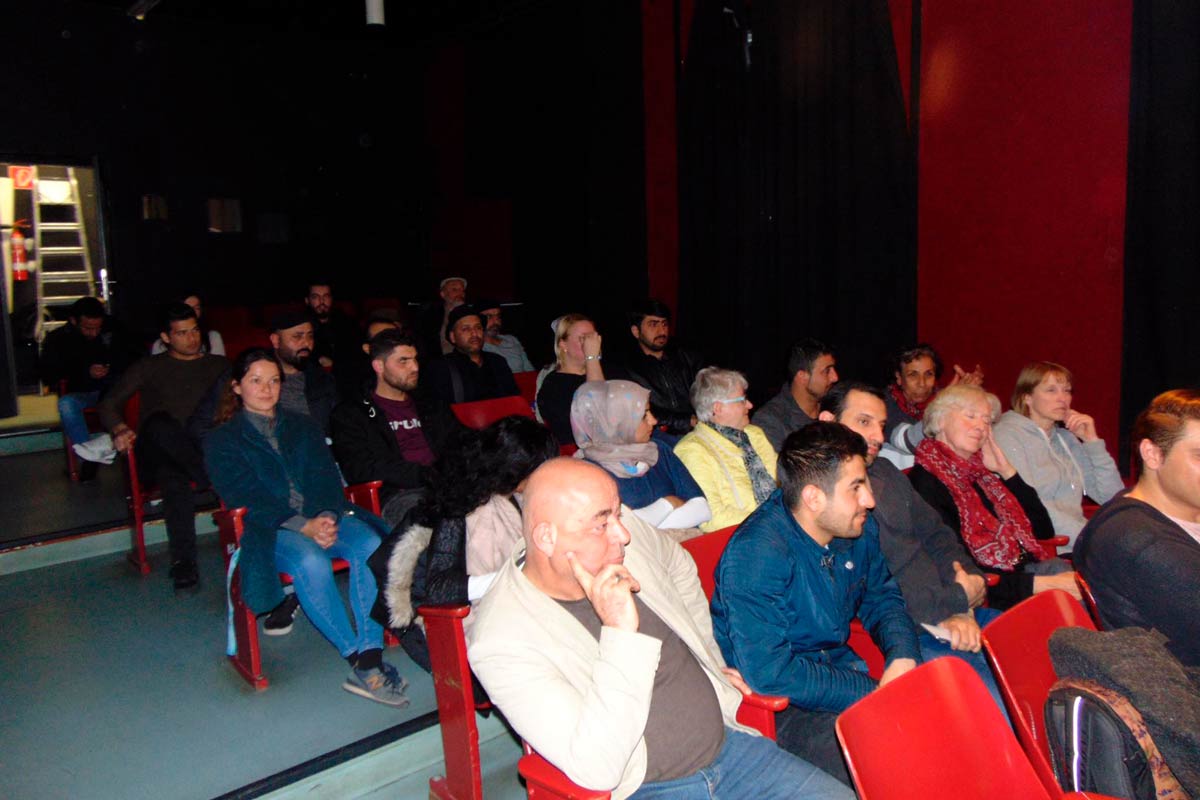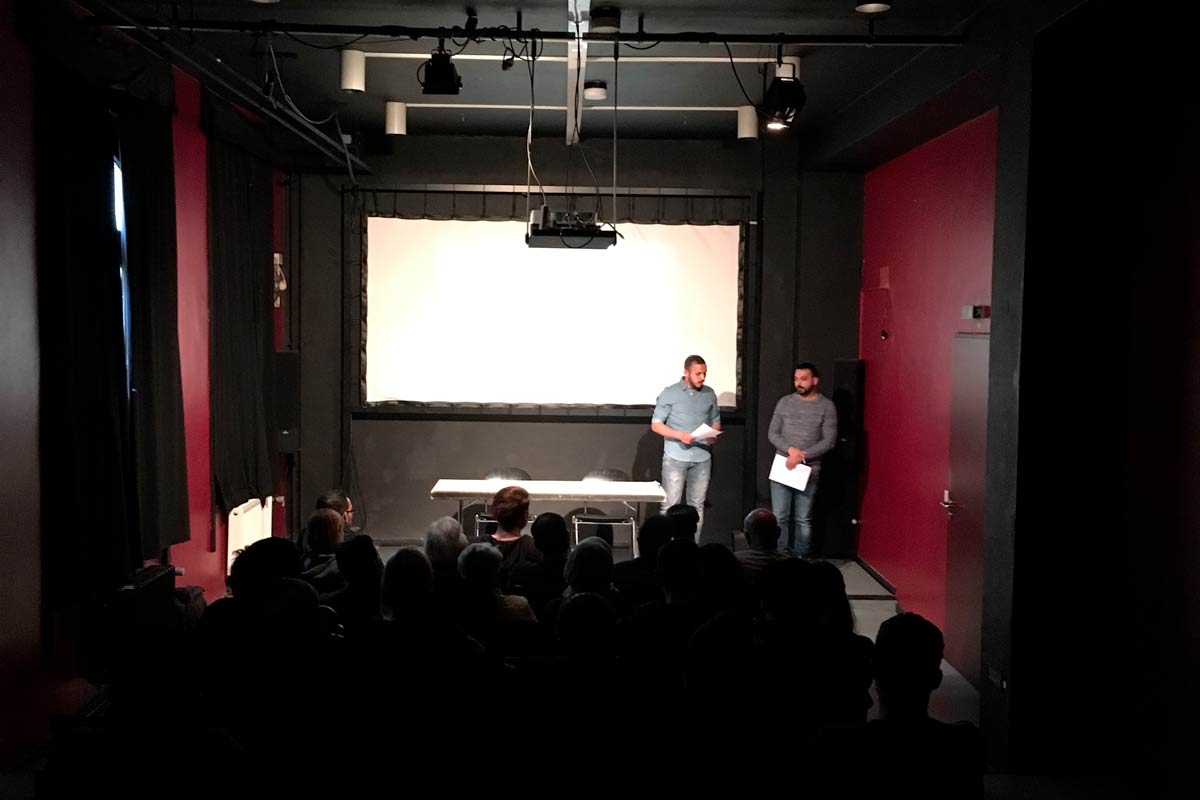 Nach einem Vortrag über das Leben in seiner Herkunftsstadt Al-Hasaka lädt er das Publikum zu einem Gespräch zum Themenfeld Alltagskulturen ein.