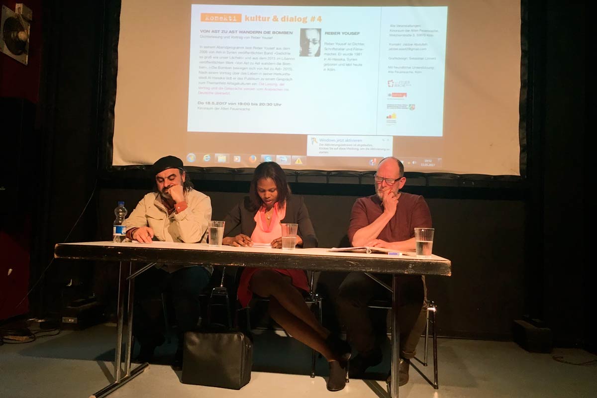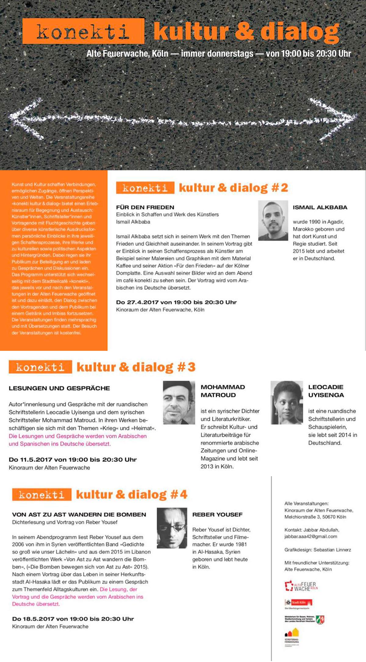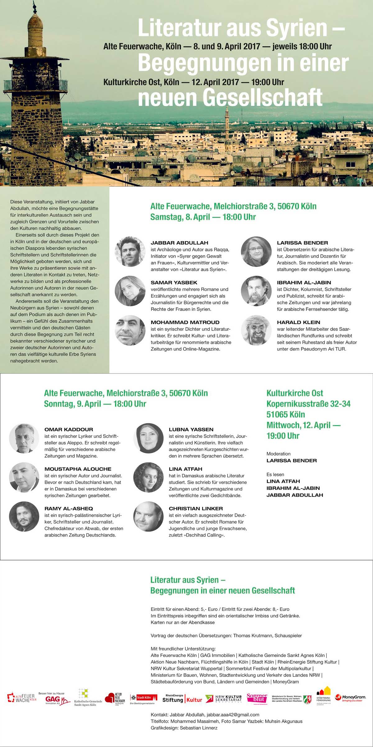 Diese Veranstaltung, initiiert von Jabbar Abdullah, möchte eine Begegnungsstätte für interkulturellen Austausch sein und zugleich Grenzen und Vorurteile zwischen den Kulturen nachhaltig abbauen. Einerseits soll durch dieses Projekt den in Köln und in der deutschen und europä- ischen Diaspora lebenden syrischen Schriftstellern und Schriftstellerinnen die Möglichkeit geboten werden, sich und ihre Werke zu präsentieren sowie mit an- deren Literaten in Kontakt zu treten, Netz- werke zu bilden und als professionelle Autorinnen und Autoren in der neuen Ge- sellschaft anerkannt zu werden. Andererseits soll die Veranstaltung den Neubürgern aus Syrien – sowohl denen auf dem Podium als auch denen im Pub- likum – ein Gefühl des Zusammenhalts vermitteln und den deutschen Gästen durch diese Begegnung zum Teil recht bekannter verschiedener syrischer und zweier deutscher Autorinnen und Auto- ren das vielfältige kulturelle Erbe Syriens nahegebracht werden.